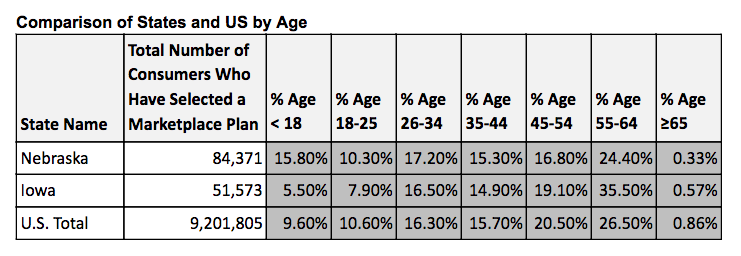 The above data shows that Nebraska’s market looked much more like economists hoped the entire country would with more young people enrolled compared to older. This ensures that there is a good mix of younger, healthier people, and older adults who may have greater health needs.