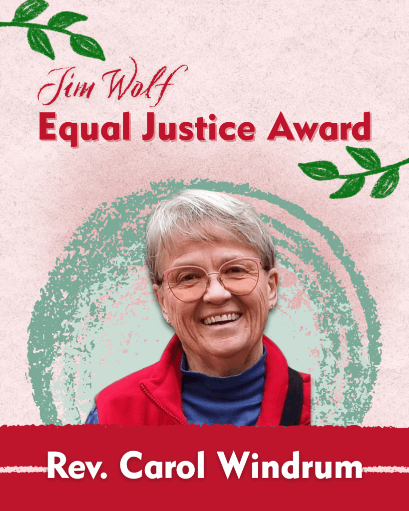 “Rev. Carol Windrum has been a tireless advocate for justice in Nebraska for more than 40 years. She has advocated for the minimum wage and workers’ rights, for Black Lives Matter, the rights of immigrant people, the rights of LGBTQ+ people, against the death penalty, against the Keystone XL pipeline, and many, many more issues. On any given week, you can find Carol volunteering in her church, preaching for social justice, bearing witness with fellow clergy, mentoring the next generations of social justice advocates in Nebraska, calling or visiting her senators’ offices, testifying at hearings in the Nebraska Legislature, penning letters to the editor, protesting in the streets, gathering for immigrant rights, and even joining national protests such as Occupy Wall Street and the People’s Climate March. Carol’s work and witness have helped to shape the terrain of social justice in Nebraska.” – Jaimee Trobough, Communications Associate