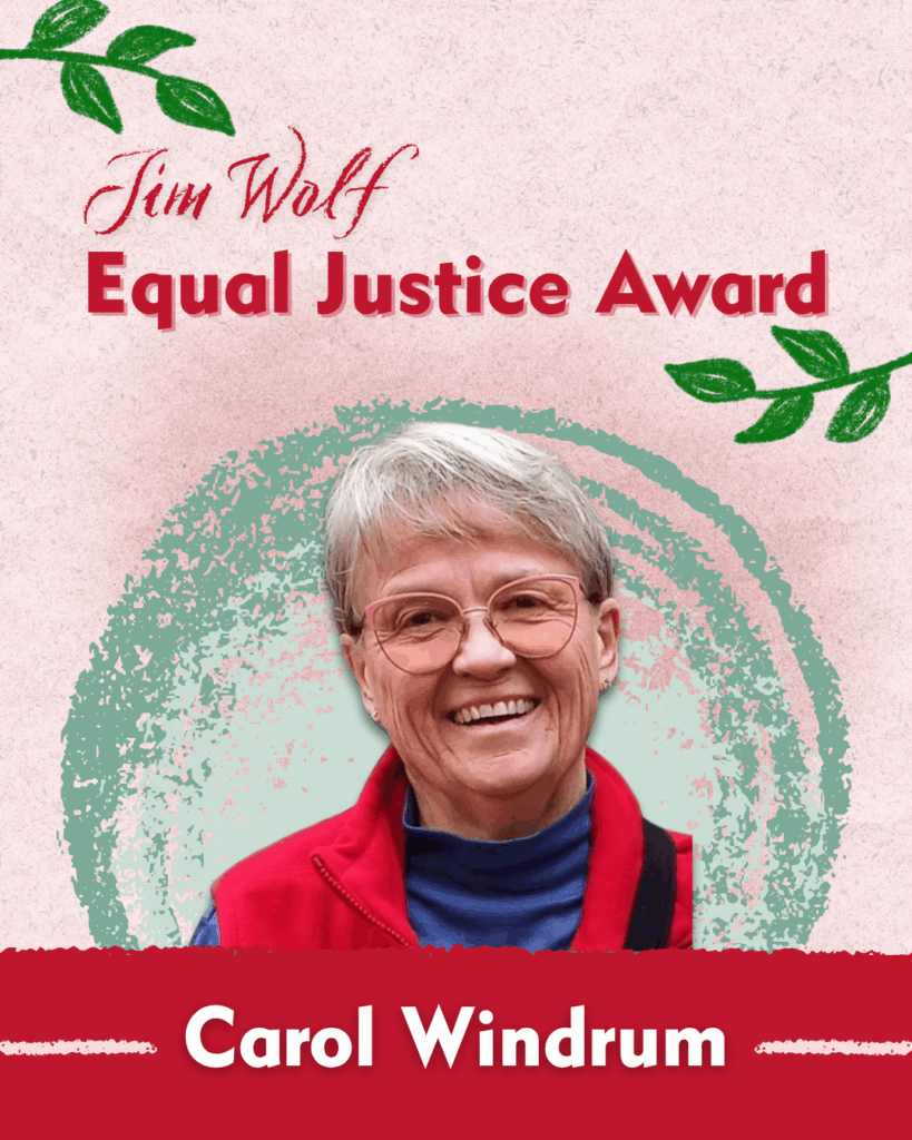 “Rev. Carol Windrum has been a tireless advocate for justice in Nebraska for more than 40 years. She has advocated for the minimum wage and workers’ rights, for Black Lives Matter, the rights of immigrant people, the rights of LGBTQ+ people, against the death penalty, against the Keystone XL pipeline, and many, many more issues. On any given week, you can find Carol volunteering in her church, preaching for social justice, bearing witness with fellow clergy, mentoring the next generations of social justice advocates in Nebraska, calling or visiting her senators’ offices, testifying at hearings in the Nebraska Legislature, penning letters to the editor, protesting in the streets, gathering for immigrant rights, and even joining national protests such as Occupy Wall Street and the People’s Climate March. Carol’s work and witness have helped to shape the terrain of social justice in Nebraska.” – Jaimee Trobough, Communications Associate